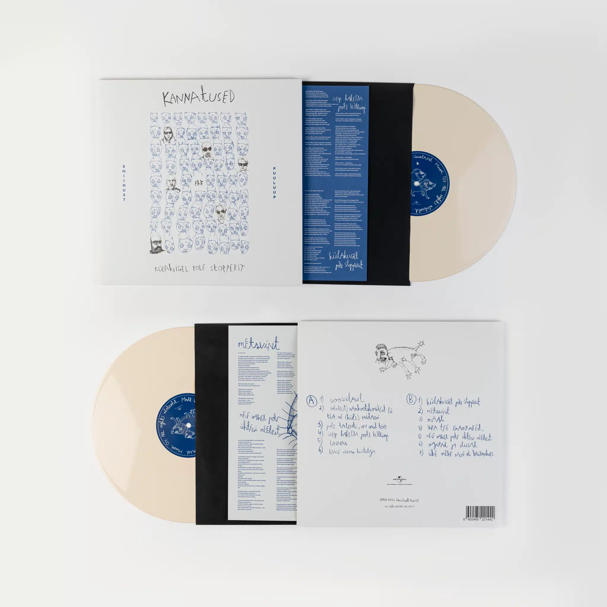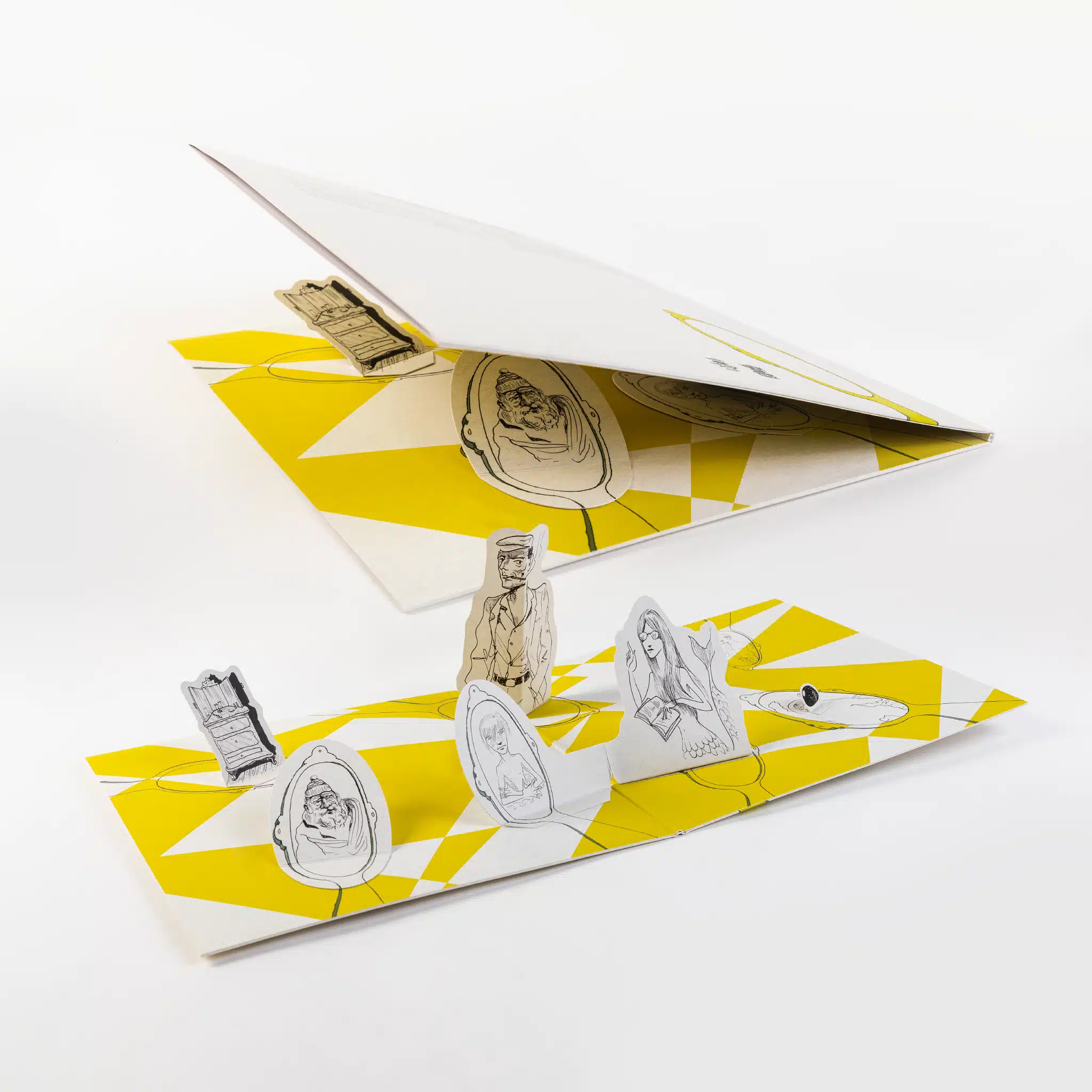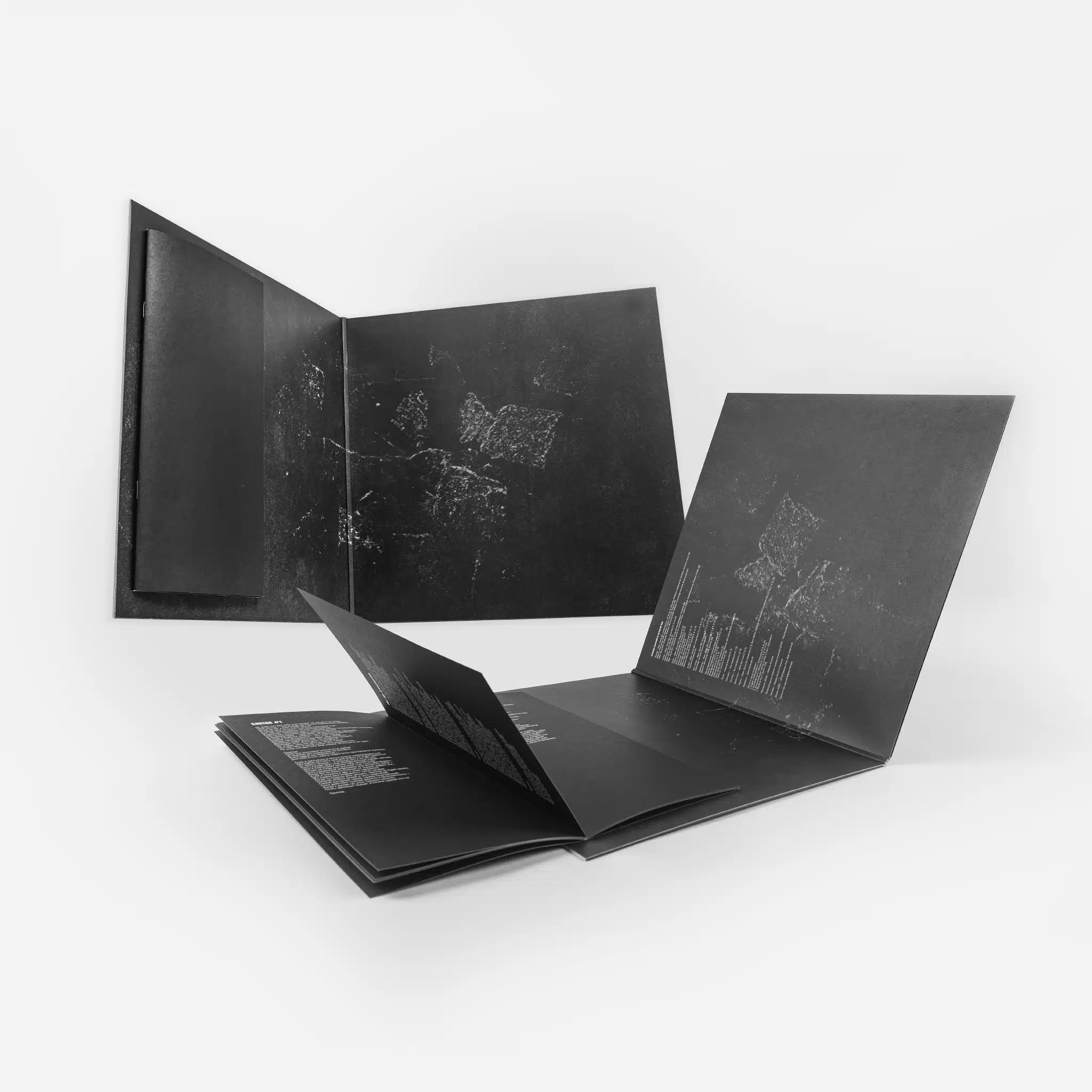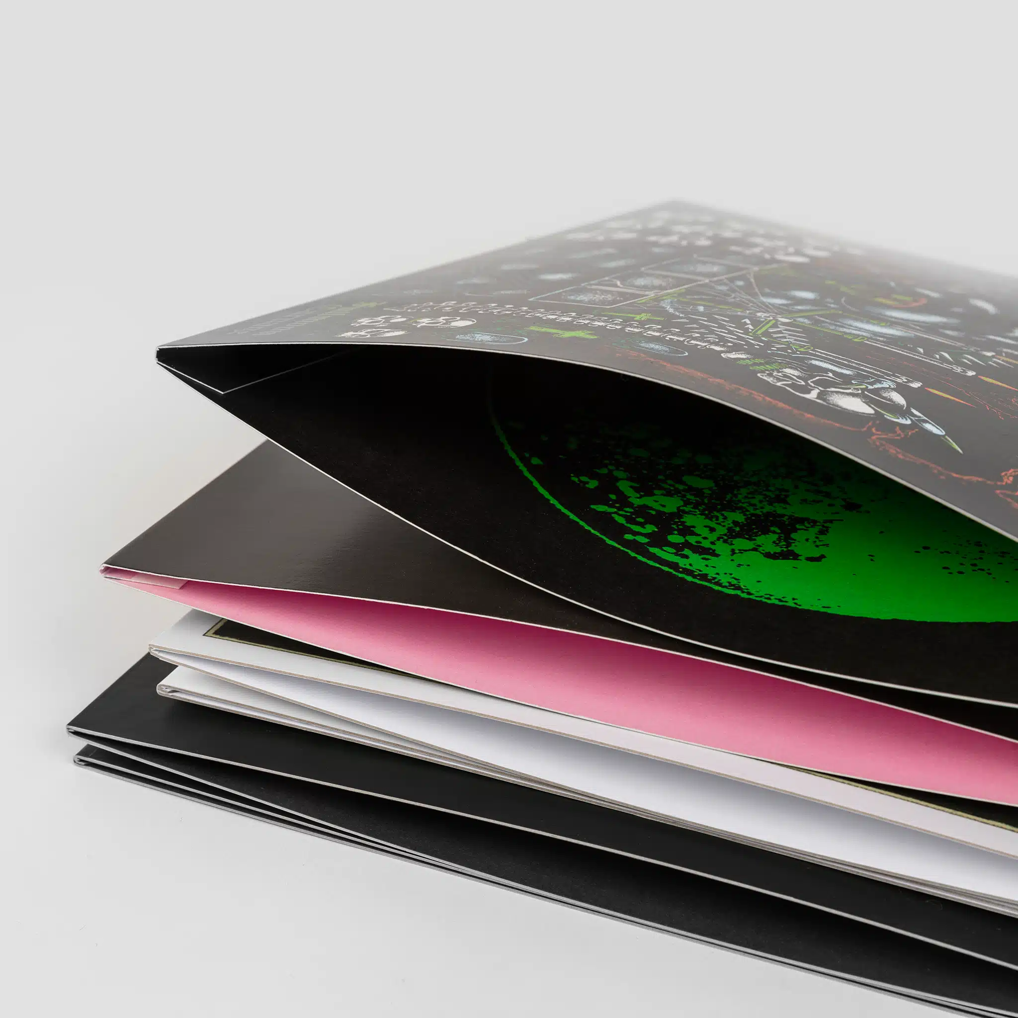 Trifold jackets have one, two, or three pockets and extra-wide spines. They can easily fit two or three records into one jacket. With graphics on the front, back, and inside, they are also a vast playground for space-demanding artworks.